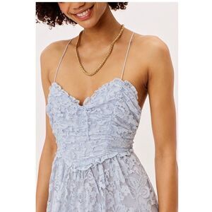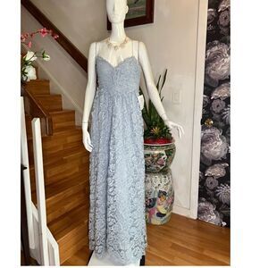 Romantic corded lace maxi dress featuring pretty mini ruffle detailing, sweetheart neckline, and delicate straps that cross at back. Feminine shirred bodice, invisible back zipper. Made of recycled poly.