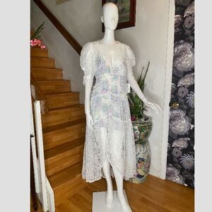 Airy sheer rigid lace midi dress featuring delicate scallop lace trim, a vintage-inspired shirred waist, and a floating hi-low midi skirt. Tonal button closure, sold with matching separate recycled poly floral print slip dress.