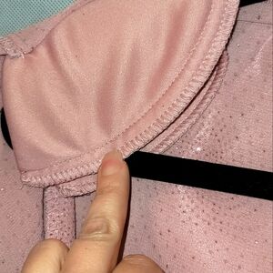 Laundered, last photo shows a small stain that is under the shimmer camisole's top on the lining which is not visible on the outside.