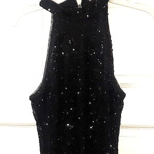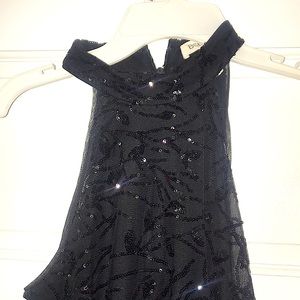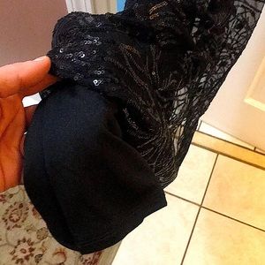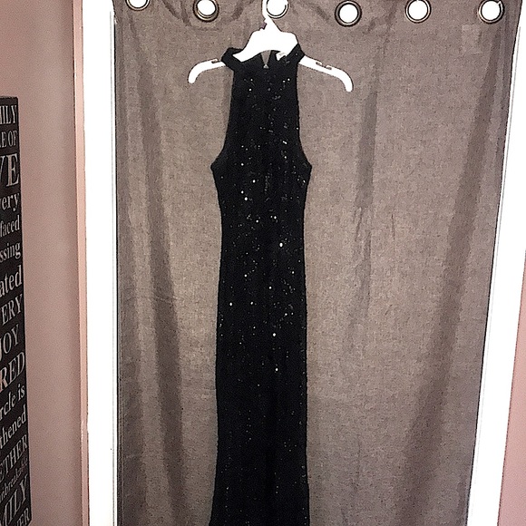 LIKE NEW WORN ONCE TO PROM LONG FORMAL DRESS GOES TO FLOOR ON My DAUGHTER WHO IS 5”2 .THE DRESS IS SOLID BLACK WITH BLACK LACE AND BLACK SEQUINS OVER LAY . SLEEVELESS AND AND GOES AROUND NECK ZIPS FROM THE BACK
