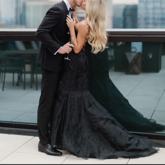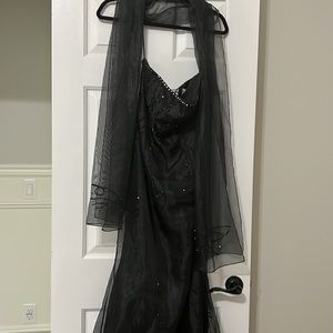 this was worn in a Wedding shoot can also be for Prom has a train that has a small bustle. super cute includes elegant shawl. The back of the dress is tied and can fit a smaller size. beautiful gown. the tag is off on the inside. bride in the photo is a size 2