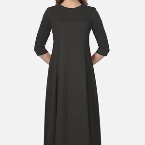This elegant black dress adds a classic touch to your formal wear wardrobe. It pairs well with silver or jeweled accents. It is a size 8 with 1/2 sleeve length and measures approximately 59 1/2" in length and 16" shoulder to shoulder. Condition is like new with no stains or tears (see photos for details). From a smoke-free household.