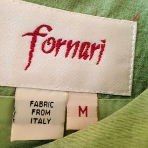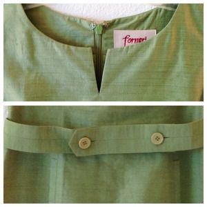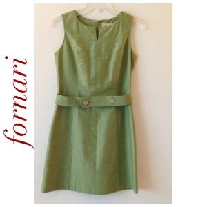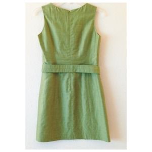 Beautiful green dress with a subtle sheen and a "V" detail at neckline. Two faux pockets in the front below the belt. Dress falls above knees. Gorgeous fabric from Italy. Shell: 25% Linen, 65% Viscose, 10% Polyammide. Lining: 100% Acetate. Gently worn. Excellent condition.