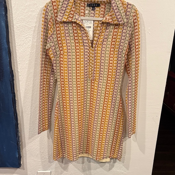 Stand out in the FORR Multicolor Geometric Mini Dress. This stylish piece features a vibrant pattern with shades of orange, purple, and cream. Perfect for any occasion.