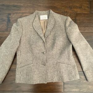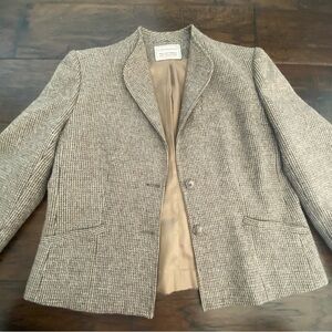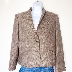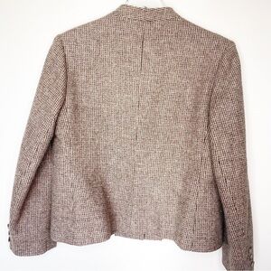 Gorgeous, mint condition tweed blazer in 100% virgin wool. Collar-less with two button closure. Side slip pockets that are still stitched closed. Fully lined.