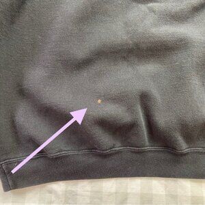 There is a minor spot in the back, see picture. The material and size tags have been removed but it is a medium size.