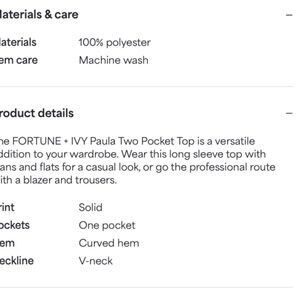 Off-white blouse/top that leans towards the more dressier side of things.I purchased it to wear with nicer jeans or underneath a cardigan or casual blazer at work. Sadly, it's too small for me. The last photo has more details about the item's materials.