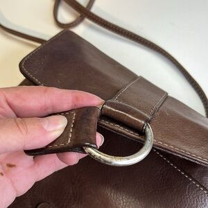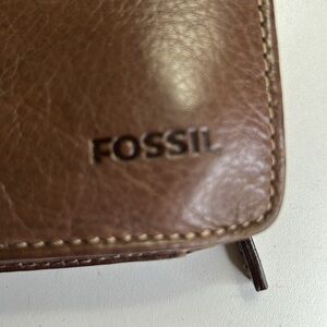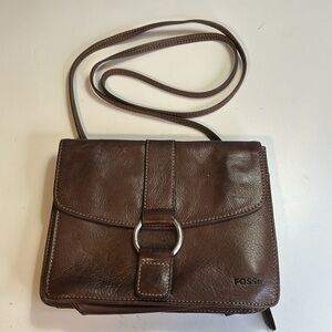 Fossil vintage cross body purse with wallet features in back zipped pocket in great shape other than silver hardware is worn as seen in pics snap front closure front slip pocket main purse with zip and slip pocket inside zip has compartments like a wallet brown I like this one measurements in pics check out pics comment with any questions