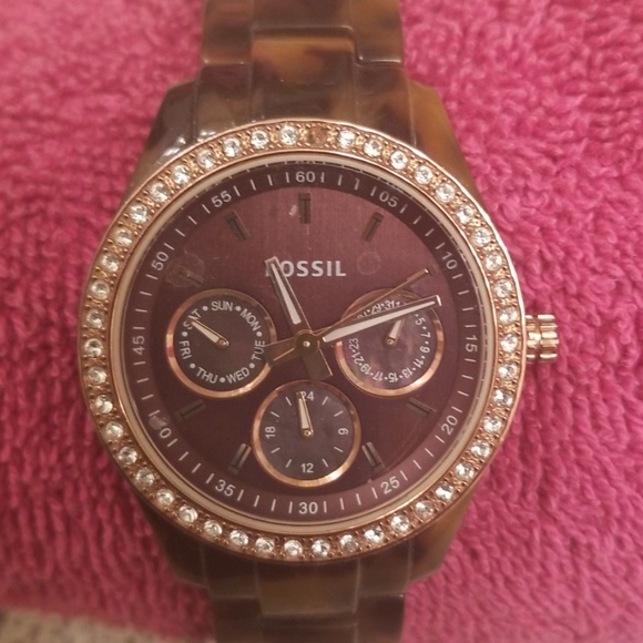 Tortoise Fossil watch, 1 stone missing, battery not included. USED. LOTS OF LIFE LEFT. Retails $139.00-$194.00 +tax.