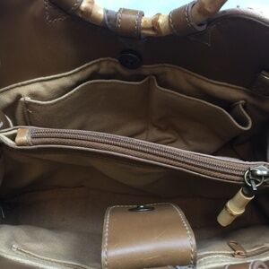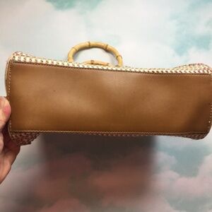 Sweet bag with great spring vibes! Bamboo handles add to its appeal. Three inside sections, one zippered with side zippered pocket and two un-zippered pockets. Multi-color raffia (not sure if it's real or synthetic) and canvas piping. Crossbody strap is missing. Excellent pre-owned condition.
