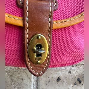 Stylish pink canvas crossbody bag featuring elegant tan leather accents. Perfect for adding a pop of color to any outfit.