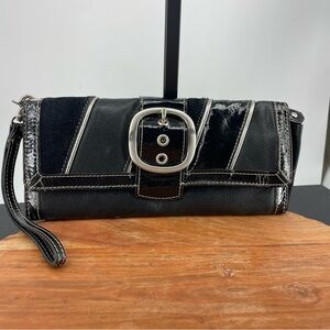FOSSIL BLACK LARGE WRISTLET CLUTCH Three Leather & Silver Tone Trim & Buckle
