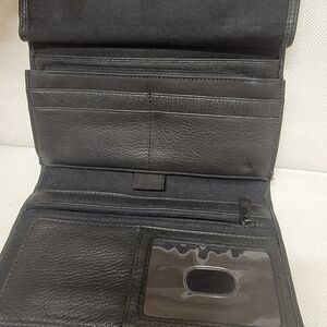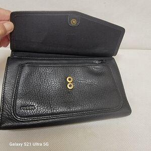 Fossil black leather 7-12" wallet. There are 2 zippered coin pockets and a license slide pocket. There are 4 slide pockets for cards and a slide for your pen. There is an area for your checkbook and a slide for paper money. Please see all pictures.