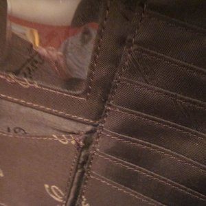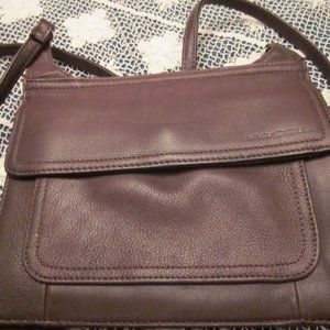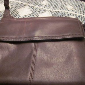 This is a Fossil brown leather crossbody organizer. The bag is 8.5" wide and 7.5 " tall. It has 2 compartments. One side is a regular bag with a zippered inside pocket with a snap closure. The other side has slide in pockets for credit cards and a large zippered pocket. This side has a flip over snap closure. The strap has a 22" drop.Clean and very gently used