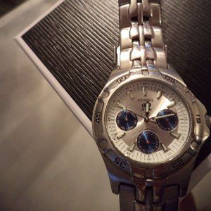 FOSSIL Blue Silver Chrome Watch w/ Blue Trim -Nice