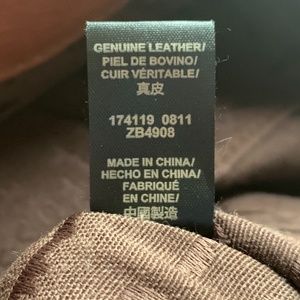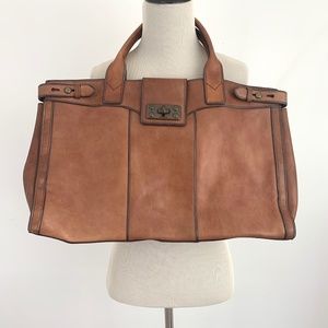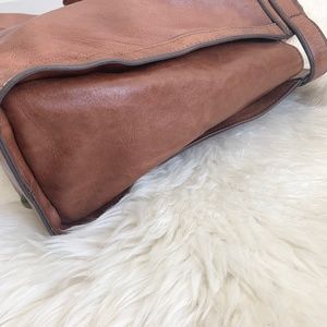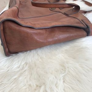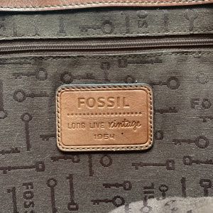Brown leather Fossil bag. Has one large zippered pocket and two smaller slip pockets inside. Metal feet on the bottom. Approx. 18”W x 12”H x 4”D with a 7.5” handle drop. Genuine leather with a textile lining on interior. Some small scratches on bag and some wear at the corner (see photos) but in otherwise excellent used condition. No stains or damage to the interior or damage to hardware.