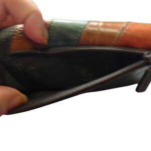 Vintage Fossil leather trifold wallet is brown with striped flap that has snap closure. The stripes are leather and suede and some are embossed. Has multiple sections inside and the back has zippered compartment.