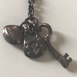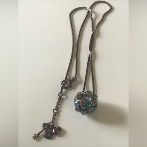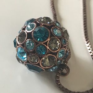 FOSSIL NECKLACE DISCO BALL circled with BLUES AND CLEAR RHINESTONES CHAIN IS A COPPER COLOR ABOUT 18 INCHES LONG