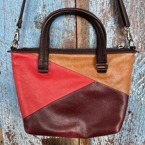 Here is a fun Fossil Dawson Satchel Leather RED Multi-color Handbag - ZB6656995 in good used condition with some light marks on leather as shown and light wear on inside. Measurements are approximately 13 x 8 x 3.5 inches.