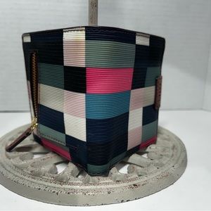 This vibrant patchwork printed PVC mini wallet features five credit card slots, one note compartment and one ID window.