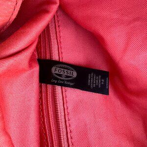 FOSSIL Erin Top Handle Fold-over Crossbody or Shoulder Bag, Soft Coral Pebbled Leather. The strap is adjustable from 23" to 43" and the bag measures 13" W x 11" H (folded) x 2" D. The inside is clean and in excellent condition. There are light signs of wear on the bottom and a couple of light spots (see photos) which may clean off. This is a super casual bag for travel or shopping. Please let me know if you have any questions