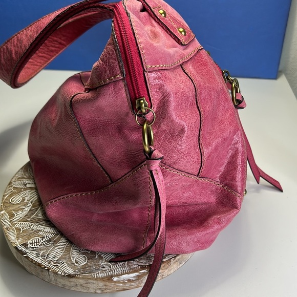 Fossil , pink flamingo colored leather, vintage, very light and unique , zip closure, pink straps two pockets in front , inside zip pocket on one side and two slip pockets on the other side, logo on front and in tab with key, brass color hardware measurement in pics, checkout pics comment with any questions