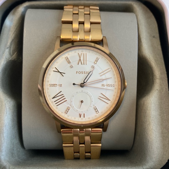This watch is in great condition. Gold with white face. Bought from Macy’s a few years ago and got it fit to my wrist size, but the extra links are included. Comes in the original Fossil tin. Just needs a new battery!