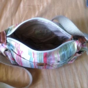 L 9.5" W 4" H 6" -cotton, zip for closure, one inside zip pocket, AUTHENTIC, two outside side pocket for cellphone pocket or sunglasses, strap not adjustable 9" drop down from shoulder. In great condition. I offer free shipping. I will subtract the value of the item to accommodate the shipping cost