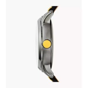 This limited edition 40mm watch features a multicolor glossy dial, three-hand movement and yellow and black nylon strap inspired by the Hufflepuff Hogwarts house.