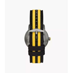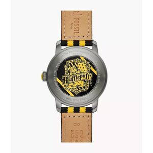 This limited edition 40mm watch features a multicolor glossy dial, three-hand movement and yellow and black nylon strap inspired by the Hufflepuff Hogwarts house.