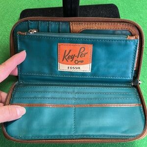 Fossil, key per polkadot wristlet, wallet, zip around coated canvas good preowned condition center zip pocket for coins, lots of cards slots, and ID one, long slots for money, satin turquoise lining fossil key logo nice little wallet check all pics comment with any question