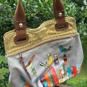 • Fabulous Vintage Fossil Key-Per Coated Canvas Bird Design Stylish Shoulder Bag Made of coated canvas this medium-sized shoulder bag features bird print pattern mirror image on both sides, silver hardware accents, and a magnetic closure.