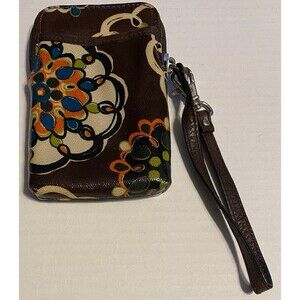 Fossil Key-Per, Wristlet Purse/Wallet/Case. It has a brown base color with a floral design and color. The inside lining is a teal with beige diamonds design. It has 3 pockets inside for cards and such and one pocket on the back. The wrist strap feels like leather and is removable and one side of that strap has a fast-access, clasp and the other is a small regular key ring.