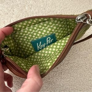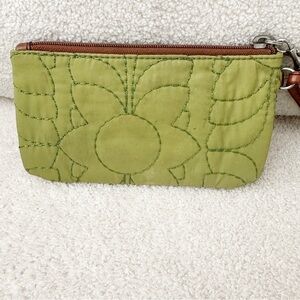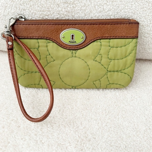 FOSSIL Key-Per Green Quilted Brown Leather Wristlet ID Coin Zip Wallet. Great shape, super cute green canvas with brown leather accents. Zips closed with lots of inside storage. Measures roughly 5x8 inches.