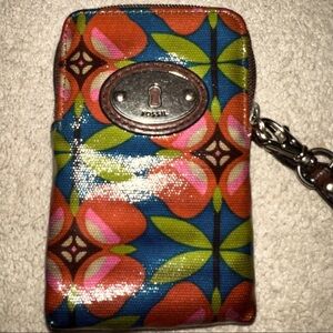 Colorful wristlet from Fossil. Forrest green and cranberry color print. Zip closure- Main, inside compartment with 3 additional sections and one outer compartment on the back. Metal Accent decoration on the front with keyhole.