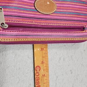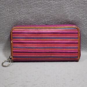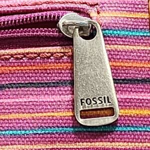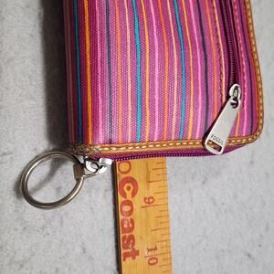 Fossil Keyper Zip Around Continental Coated Canvas with leather trim wallet stirpes in pink, orange, yellow, black and blue. 3 Pocket Zip Around Closure Keychain Retired Discontinued