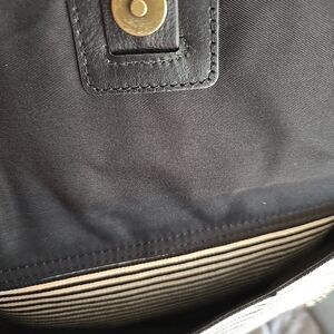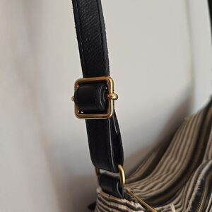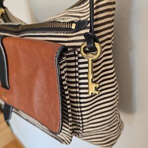 FOSSIL Kinley Medium Black White Striped Tan Leather Canvas Crossbody Bag Purse