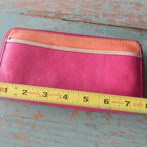FOSSIL LARGE ZIP AROUND PINK LEATHER WALLET. HAS AN ORANGE/WHITE STRIPE DETAIL AT TOP. NICE LARGE SIZE. SOME OVERALL DIRT/WEAR AND CORNERS SHOW SOME WEAR/RUBBING AS SHOWN, INSIDE IS CLEAN AND IN GOOD USED CONDITION.