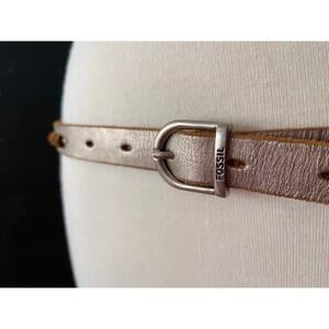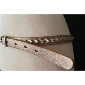 FOSSIL Metallic Studded Belt w/Laser-Cut Accent size L. Featuring a metallic leather strap w/laser-cut accents, silver studs, stitch accent and a logo embossed silver buckle.