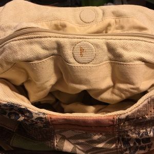 Fabulous FOSSIL Patchwork Handbag. Spacious Bag, Three sections, one with a small zipper, compartment, The Middle one has a Zipper closure, and the last one has two pockets. Two pockets on the sides of bag. Fossil Key attached to handle. This bag was used a lot, it does show mild wear, and there is a small stain on one of the Magnetic Closure, see to picture, and minor wear on the handles, other than that bag is in good condition. 8/10. It's a FABULOUS BAG!!!!❤️❤️❤️❤️❤️❤️. Selling for a friend.