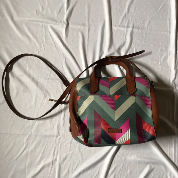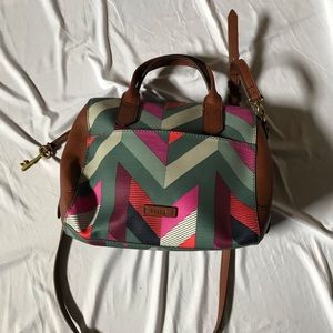 Fossil purse with two handles and detachable crossbody strap. Lots of interior pockets. Fun chevron design. Man made material with leather trim and straps. Very good used condition.