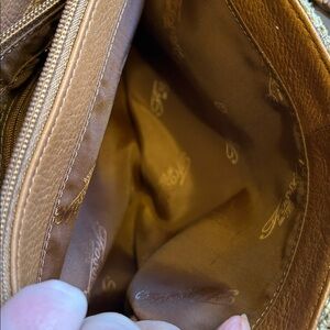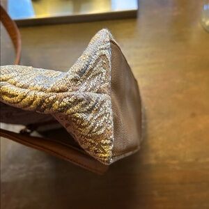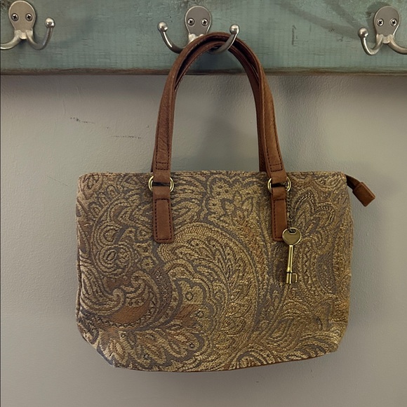 This elegant FOSSIL handbag features a sophisticated paisley design in rich brown tones. Has 3 compartments but the middle one is zippered. The bottom and corners look great. The handles look great too!Perfect for adding a touch of class to any outfit. Also has Key bag charm!