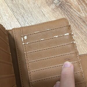 - preowned, fair condition with leather peeled from interior and possible water damage on leather of button closure, despite that and other minor wear still has life left