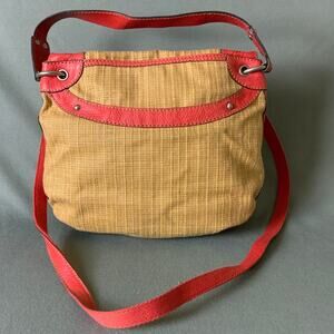 FOSSIL Red Leather Strap Tan Straw Woven Handbag Versatile
