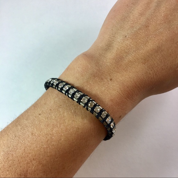 FOSSIL silver leather cord bracelet | black cord wraps rhinestones between silver cord | silver fossil stamped button closure | some very minor tarnishing on button, some minor wear to leather loop that wraps around Button | length is 8”
