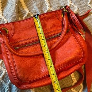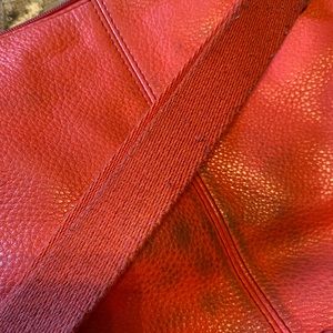 Red/coral leather satchel. Has wear/staining from jeans in the leather and pilling on strap. Used condition.