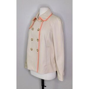 Rounded peter pan style collar ~ Long sleeves with a decorative button tab near the end ~ Hook & Bar closure at neckline ~ Double breasted with two rows of buttons down the front ~ Two inset hand pockets on the front ~ Buttoned flap on the upper back ~ Fully lined ~ Swingy silhouette ~ Twill like fabric ... with a subtle texture to the fabric ~ Light tan with coral pink trims at collar, across back flap and down the front edge