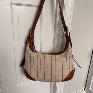 FOSSIL Tan W/ Blue Stripes HANNAH HOBO Canvas & Leather Shoulder Bag