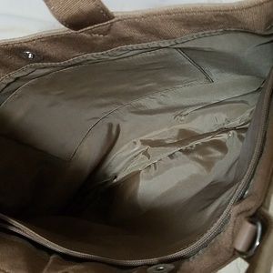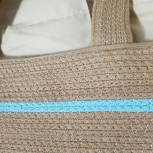 Versatile FOSSIL tote / handbag perfect as a purse or for toting whatever you tote! Camel and robin's egg blue woven cotton for effortless style! Inside is perfect and features an interior zippered pocket, an un-zippered pocket for quick acccess and a large (width of the entire bag) zippered pocket for security. One-snap closure. Some slight variation in color due to weave.