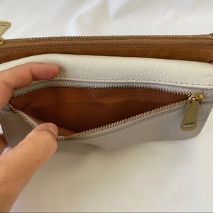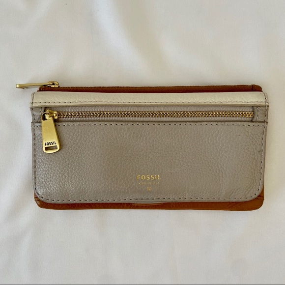 FOSSIL WALLET - Beautiful leather tri-colored with lots of storage: a clear ID slot, 9 card slots (not including the ID slot), 2 bill slots, & 2 zippered compartments, perfect for all your needs. From smoke free home.
